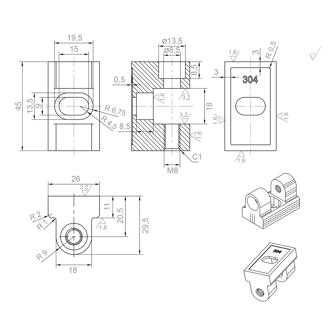 Het scharnierlichaam is vervaardigd van hoogkwalitatief roestvast staal AISI 304, wat langdurige corrosiebestendigheid garandeert — zelfs in omgevingen met verhoogde vochtigheid, zoals badkamers, zwembaden of douchecabines. De satijnen oppervlakteafwerking maskeert effectief vingerafdrukken en vervuiling, waarbij het esthetische uiterlijk behouden blijft met minimaal onderhoud. Op de technische tekeningen is de oppervlakteruwheid Ra 1,6 en Ra 3,2 aangegeven — wat de precieze mechanische bewerking van onderdelen bevestigt.