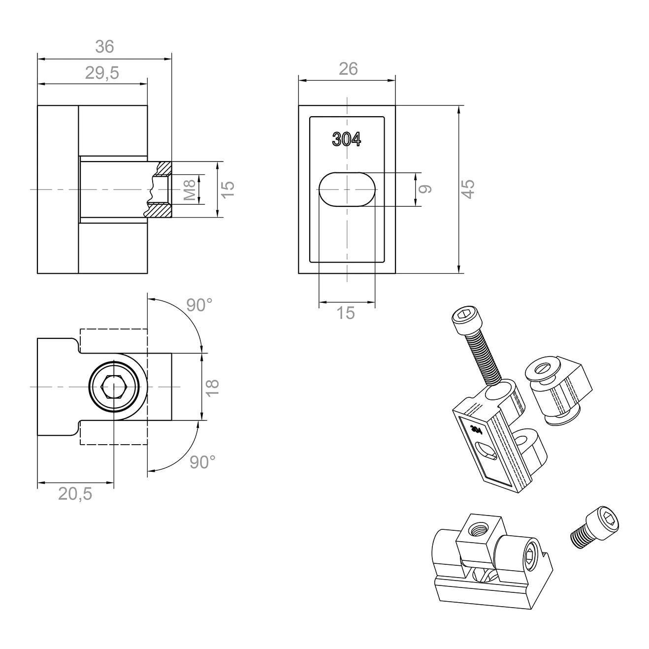 - Afmetingen draaibare connector: 24,5 × 18 × 15 mm