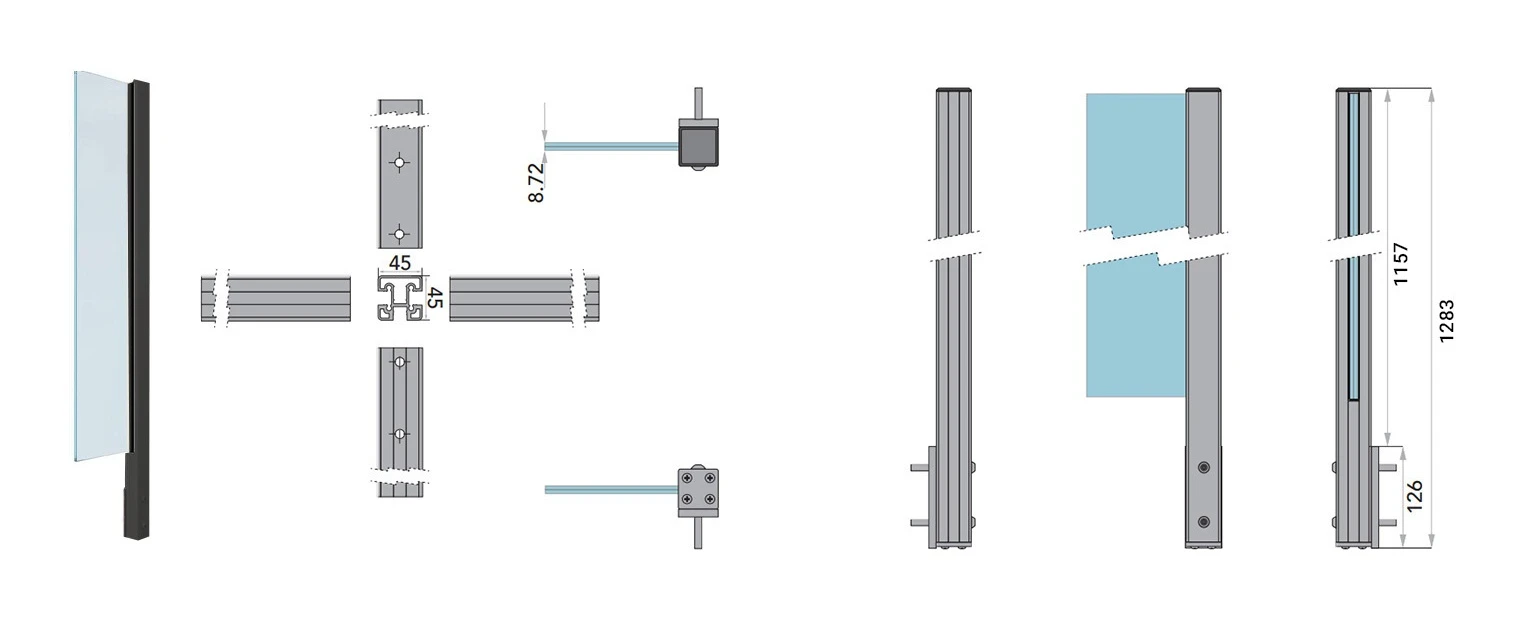 - Aluminium profiel 45×45 mm — gunstige verhouding stijfheid/gewicht, eenvoudige bewerking op de bouwplaats