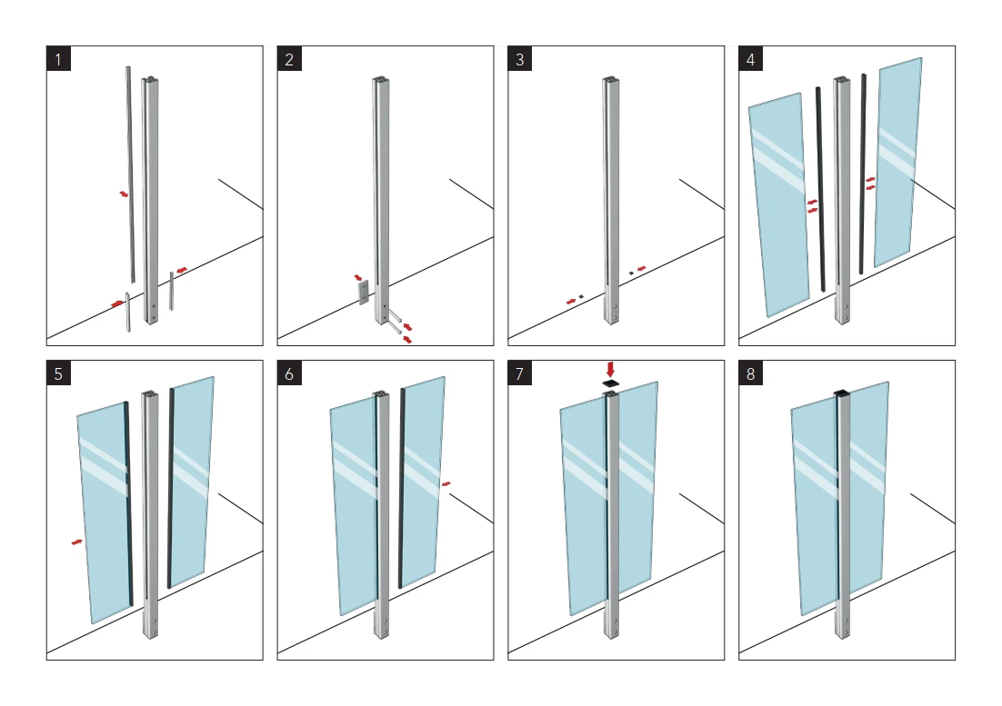 Montage van KR7300 paal verloopt in 8 eenvoudige stappen — van plaatsing van profiel op plaatrand, via bevestiging van afdekplaat en afdichtingen, tot inschuiven van glasplaat en beveiliging met bovenste afdekkap. Het hele proces vereist geen gespecialiseerd gereedschap en maakt efficiënte uitvoering van meerdere secties op één werkdag mogelijk.