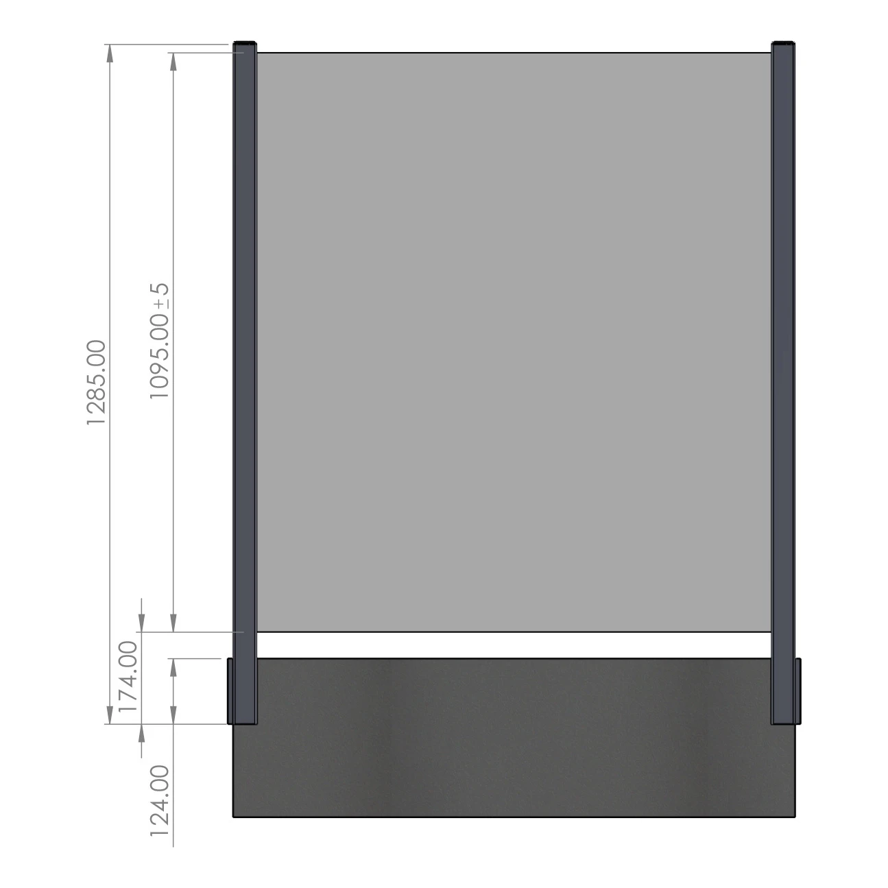 Zijmontage maakt het mogelijk om de glazen vulling dicht bij de vloerrand te plaatsen zonder ingreep in het balkonoppervlak. De maattekening bevestigt dat de totale bouwselhoogte 1285 mm bedraagt, waarvan 1095 mm voor het glaspaneel en 174 mm de opening tussen de onderkant van het glas en de bovenkant van de montagebasis. Deze maatvoering zorgt voor de door normen vereiste balustradehoogte terwijl esthetische verhoudingen van de elementen behouden blijven.