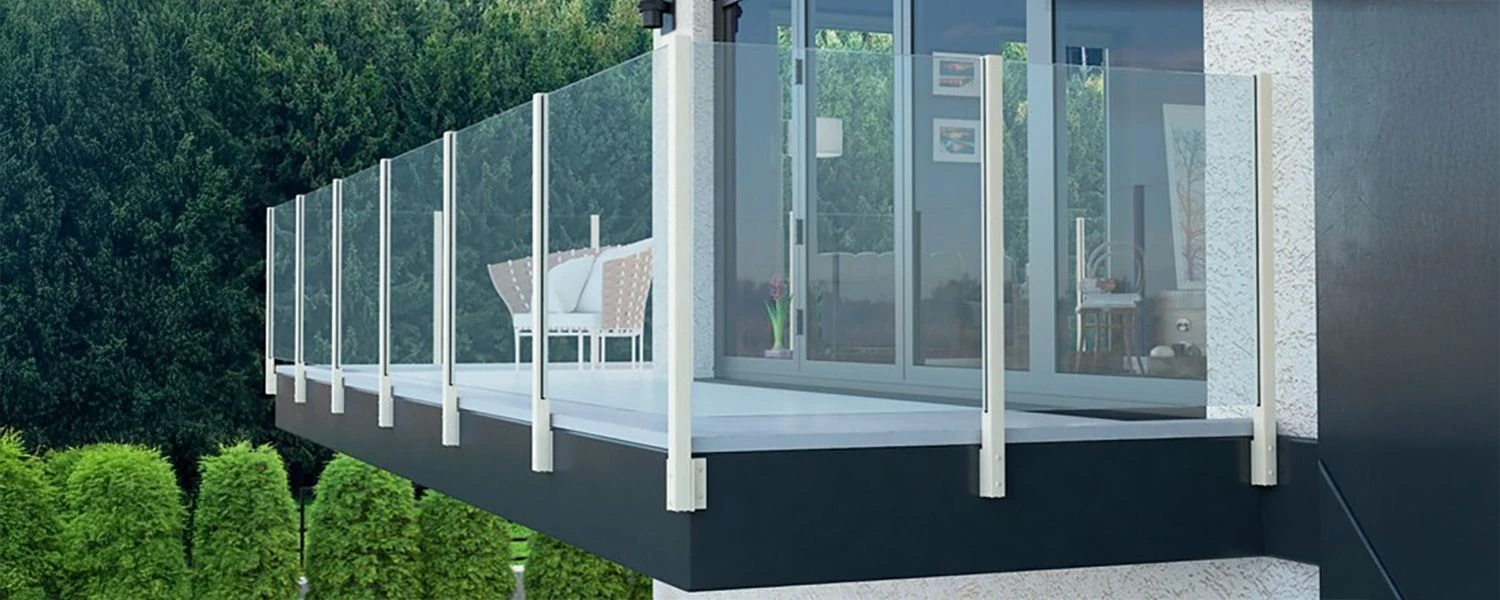 - Zijmontage aan de voorkant van plaat of traploop — maakt balkonoppervlak vrij en vergemakkelijkt inrichting