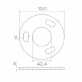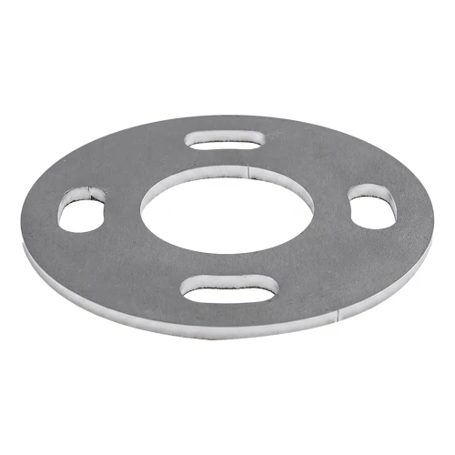 De voetplaat bevestigt de ronde balustradepaal aan de ondergrond door middel van lassen. Vier langwerpige montagegaten maken positieregeling van de bouten mogelijk, wat de precieze uitlijning van de paal tijdens montage aanzienlijk vergemakkelijkt. De centrale opening met diameter 42,4 mm is afgestemd op standaard balustradebuizen in het 42,4 systeem. De montageplaatsen kunnen worden afgedekt met een speciale afdekrozet (apart verkrijgbaar), voor een esthetische afwerking van de constructie.
