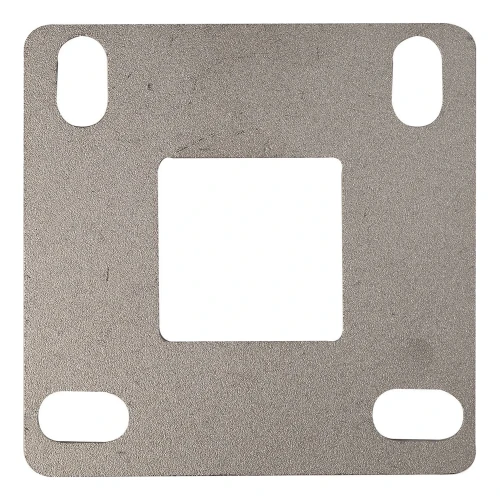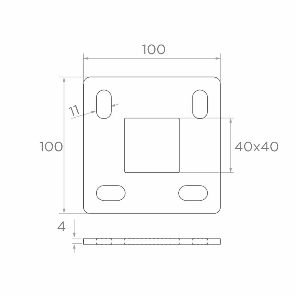 De voetplaat heeft een centrale vierkante opening 40x40 mm aangepast aan het paalprofiel en vier montagegaten van het ovale type (11x20 mm), die precieze positie-aanpassing mogelijk maken tijdens vastschroeven aan de ondergrond. Het ruwe oppervlak (zonder extra afwerking) maakt lassen mogelijk zonder de noodzaak om coatings te verwijderen — klaar voor gebruik direct uit de verpakking.