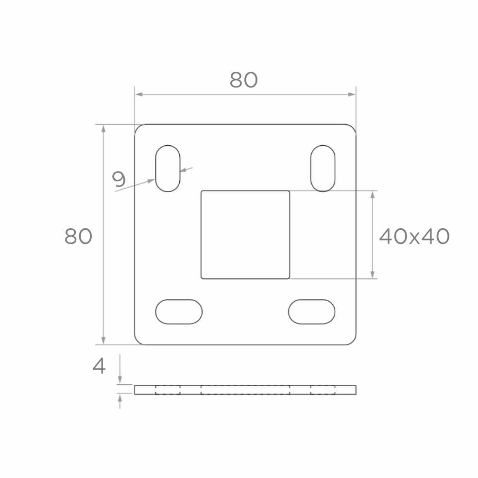 Vier ovale montagegaten (9×20 mm) zorgen voor flexibiliteit bij het verankeren aan de ondergrond — positieregeling van schroeven vergemakkelijkt nauwkeurige instelling van de paal zelfs op ongelijke oppervlakken. De centrale opening 40×40 mm is aangepast aan het standaard vierkante profielsysteem, wat compatibiliteit garandeert met populaire balustradepalen.