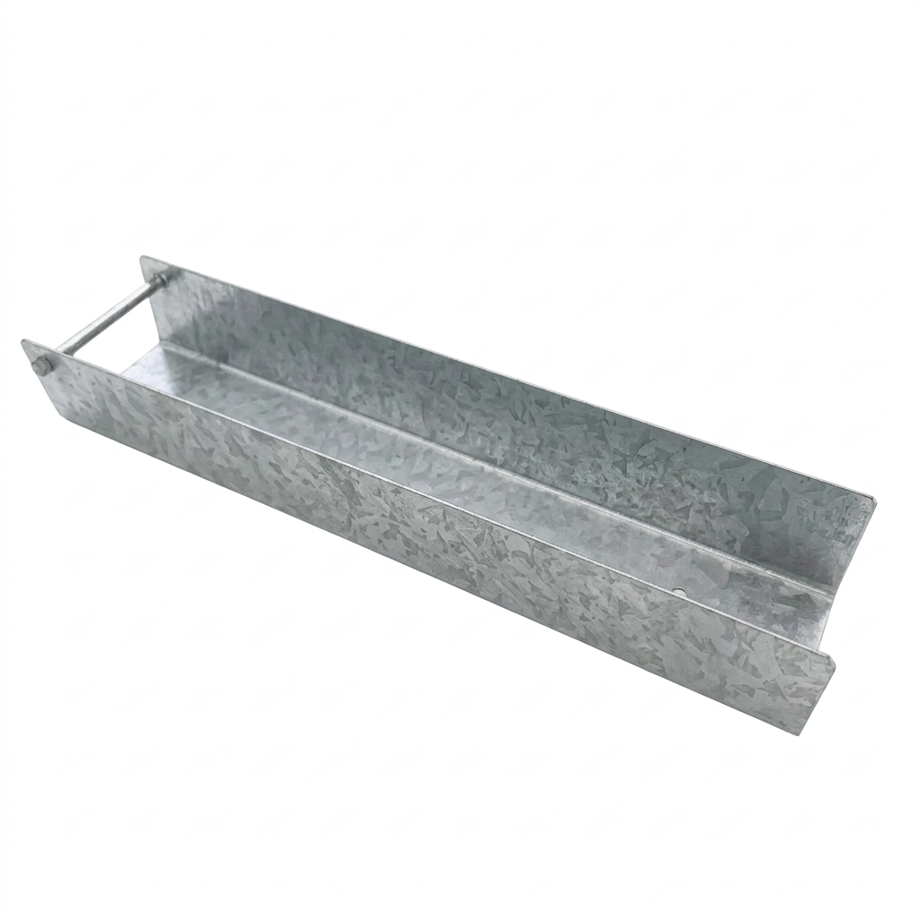 Het C-profiel heeft een profiel in de vorm van de letter C, waarin de betonnen funderingsplaat wordt geplaatst. De binnenbreedte van het profiel bedraagt 52 mm, wat zorgt voor vrije en stabiele plaatsing van een plaat met dikte 50 mm met kleine montagespeling die het plaatsen vergemakkelijkt. De ingebouwde dwarsstaaf Ø 6 mm fungeert als blokkering — voorkomt dat de fundering uit de houder schuift, waardoor de duurzaamheid en veiligheid van de gehele hekwerkconstructie wordt verhoogd.