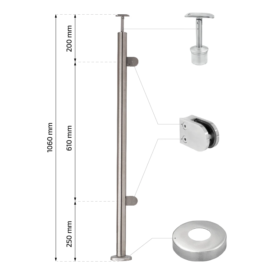 Eindpaal rechts/links Ø 42,4x1060mm AISI304 2 glashouders vloermontage
