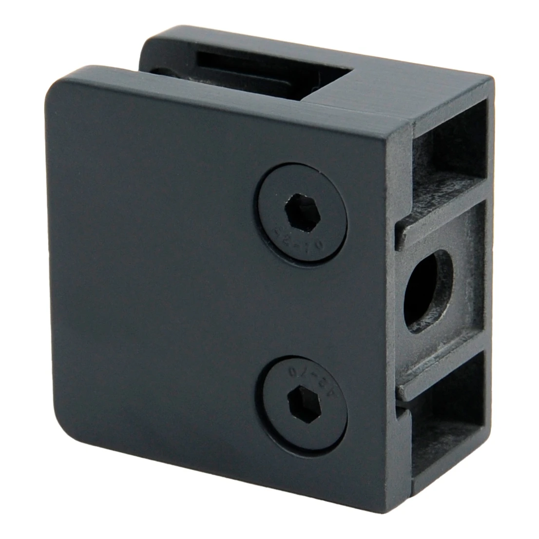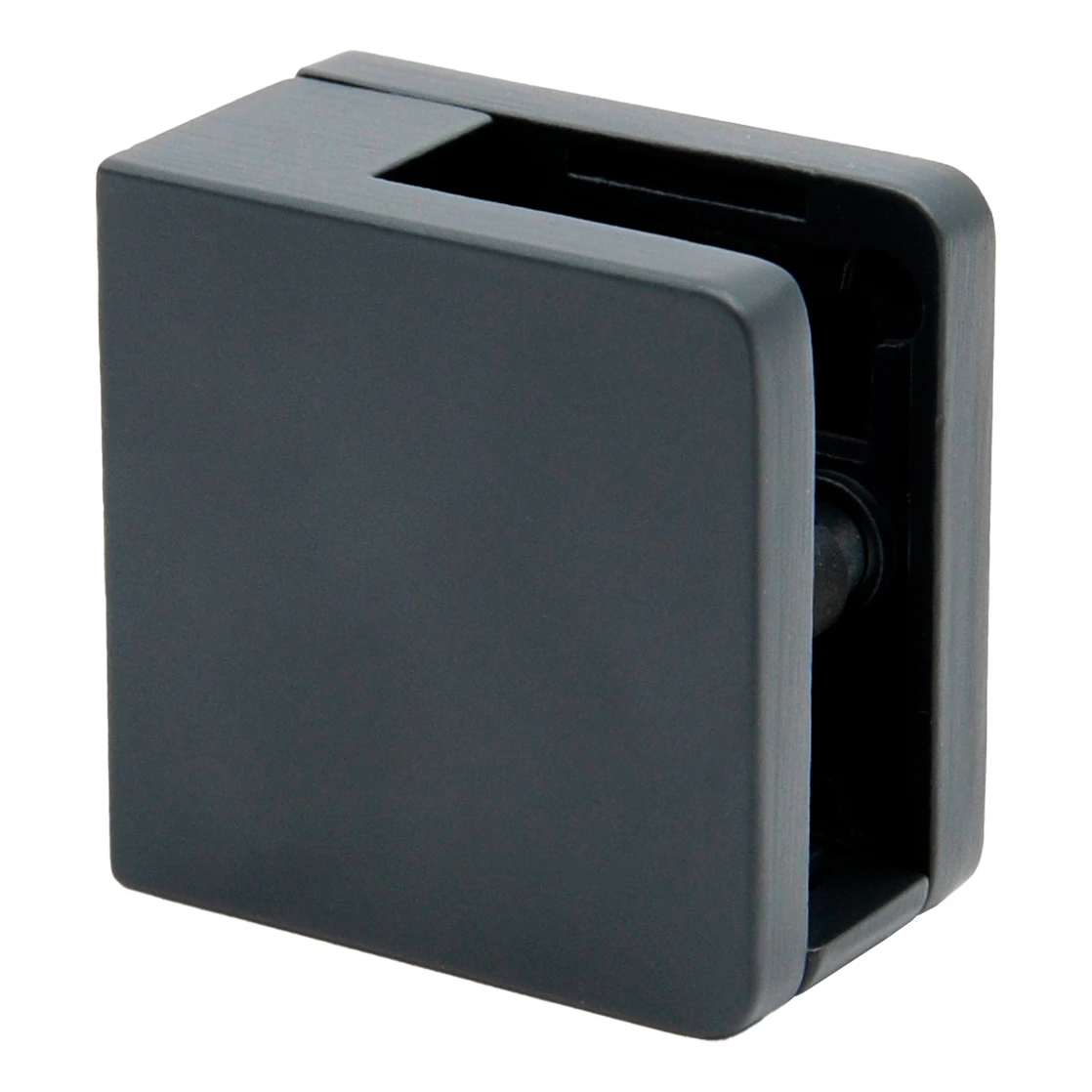 Rechthoekige glashouder in antracietkleur, bestemd voor montage op vlakke oppervlakken met beugel. Geschikt voor het stabiel bevestigen van glasplaten met een dikte van 6 tot 10,76 mm in systeemglasbalustrades. Vervaardigd uit zamak en afgewerkt met poedercoating, biedt deze houder een hoge duurzaamheid en een stijlvolle, moderne uitstraling.