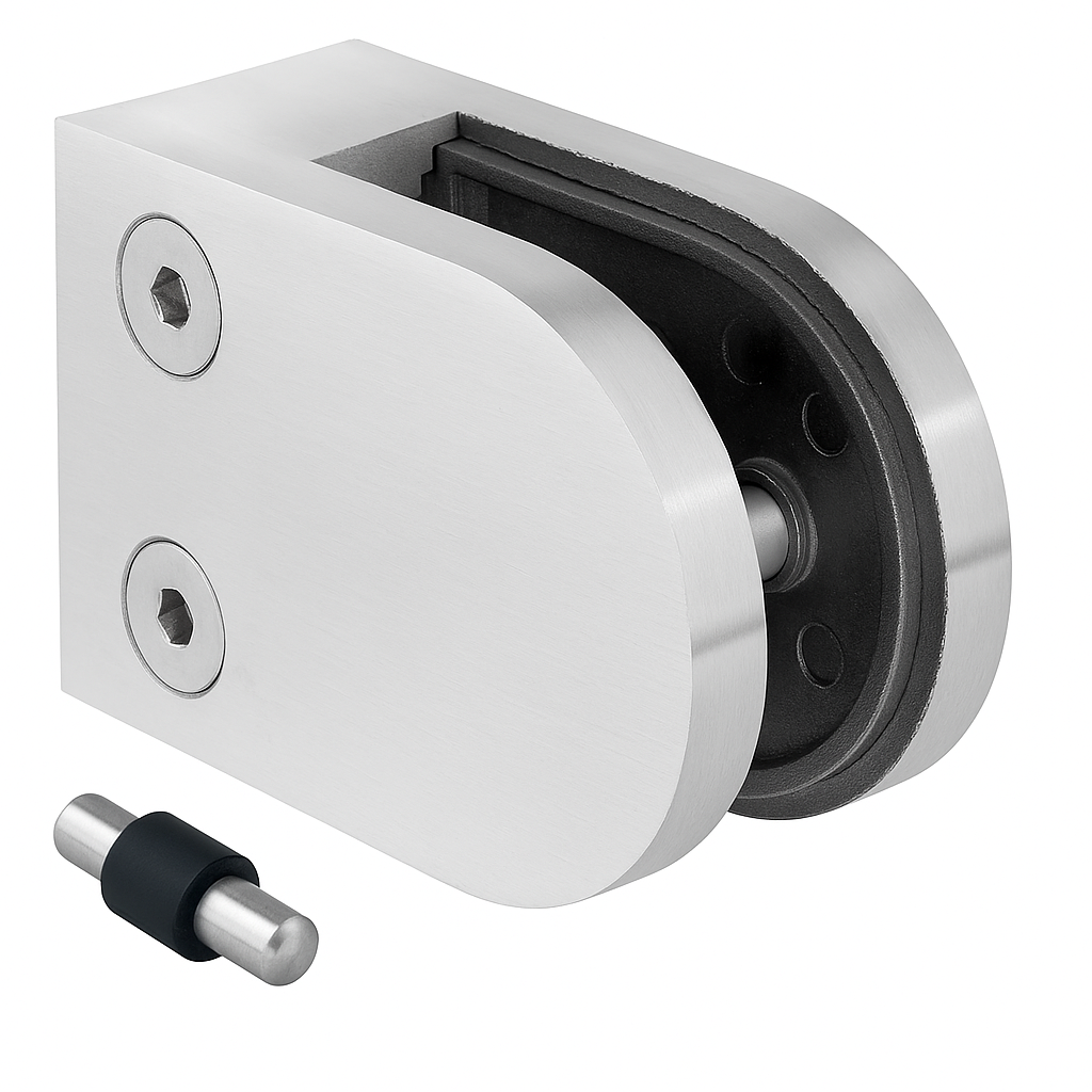 Glashouder van roestvrij staal AISI 304 geschikt voor de montage van glazen panelen met een dikte van 6 tot 10,76 mm. Het product met satijnafwerking zorgt voor een esthetisch en professioneel uiterlijk van balustrades en glazen constructies. Dankzij de inschroefconstructie is de houder specifiek ontworpen voor bevestiging op vlakke oppervlakken, wat een snelle en herhaalbare montage mogelijk maakt in balustradesystemen, glazen afschermingen en binnen- en buitenwanden.