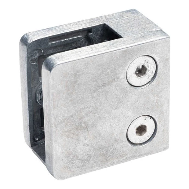 Rechthoekige glashouder 45×45×26 mm met steun en borgpen — bestemd voor de montage van glasplaten met een dikte van 6 tot 10,76 mm in systeemglasbalustrades. De compacte constructie van ruw zamak zorgt voor betrouwbare stabilisatie van het glas op vlakke oppervlakken, en de inbusbouten maken een nauwkeurige instelling van de klemkracht mogelijk zonder de houder te demonteren.