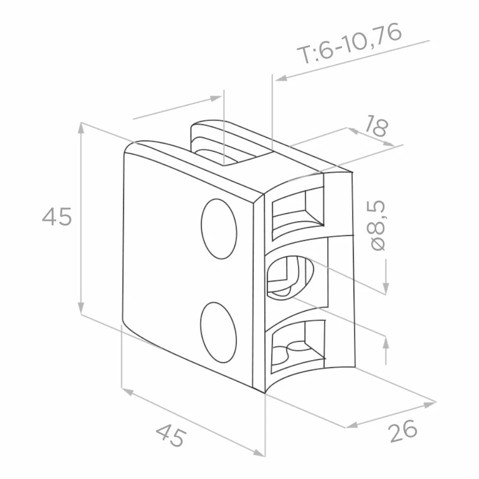 De compacte afmetingen van 45×45×26 mm en het brede geaccepteerde glasdiktebereik (van 6 mm voor enkelvoudig glas tot 10,76 mm voor gelaagd glas) maken deze houder tot een veelzijdig onderdeel voor balustradesystemen, glazen afscheidingen en omheiningen op basis van buizen met een diameter van 42,4 mm.