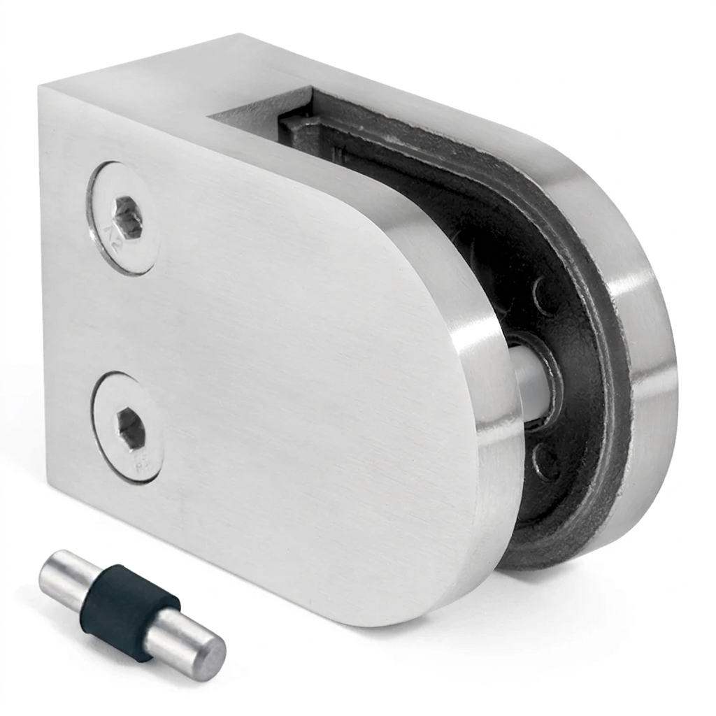 Het houderlichaam is vervaardigd uit roestvrij staal AISI 304 — een corrosiebestendig type dat zowel binnen als buiten kan worden toegepast. De gepolijste (spiegel) afwerking geeft het een elegante uitstraling die perfect aansluit bij moderne interieurs en exterieurontwerpen met glas. De interne rubberen afdichting zorgt voor een stevige grip op het glas zonder risico op krassen. Twee inbusbouten maken een nauwkeurige instelling van de klemkracht mogelijk — zonder de houder volledig te demonteren, wat de montage en eventuele aanpassingen op de bouwplaats aanzienlijk versnelt.
