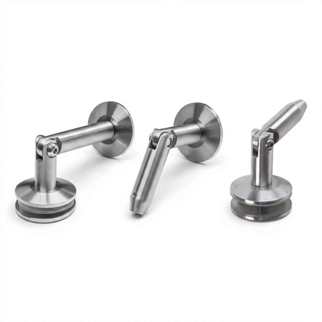 Het systeem bestaat uit drie nauwkeurig vervaardigde verbindingsstukken van roestvrij staal AISI 304 met een satijnafwerking, die jarenlange duurzaamheid en een esthetisch uiterlijk garanderen. Elk element beschikt over een verborgen montagegat, wat de gehele constructie een elegante, minimalistische uitstraling geeft. Het glas komt niet direct in contact met het metaal — de set bevat drugrubbers die de glasplaat beschermen en tegelijkertijd in de juiste positie stabiliseren.