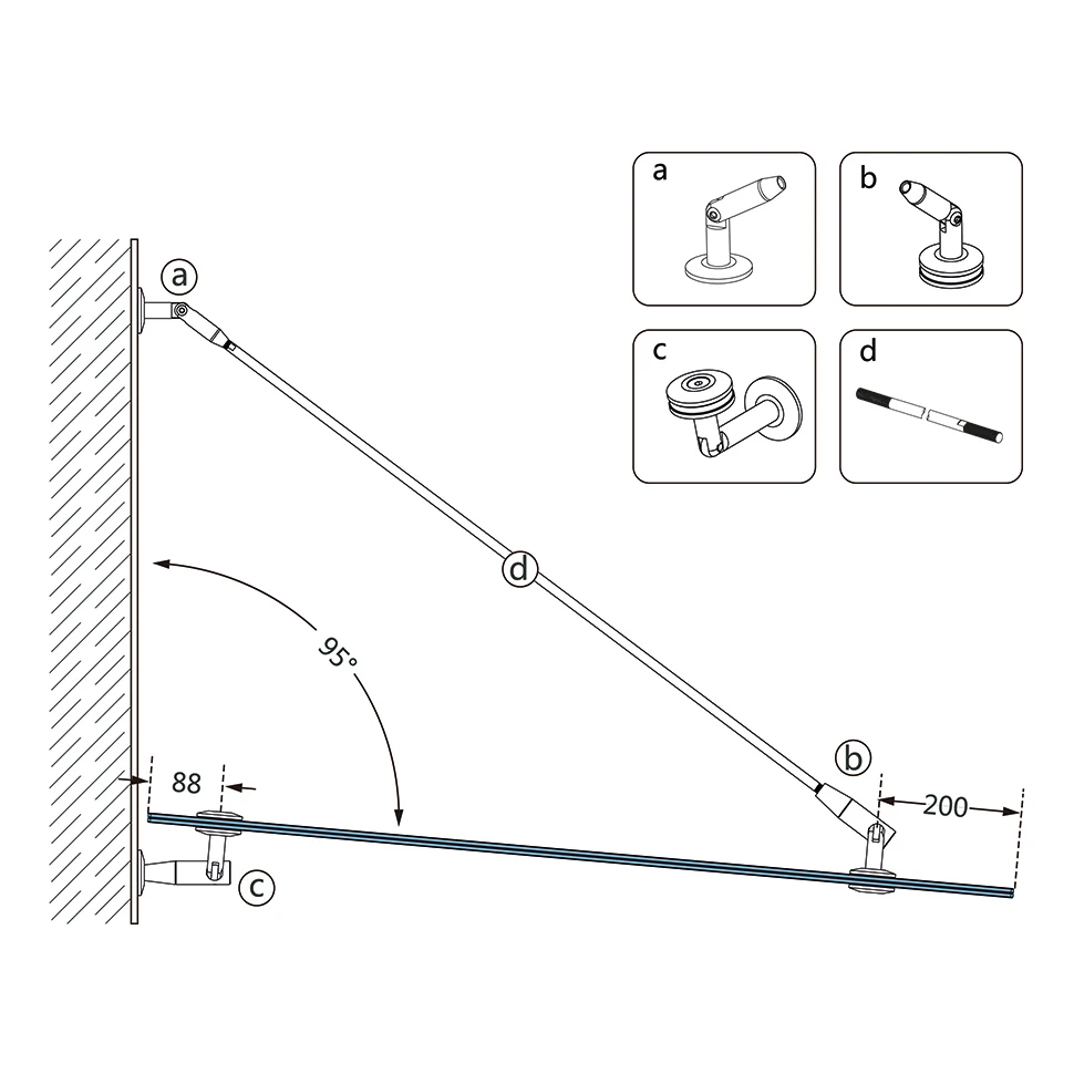 De trekstang wordt in de gevel van het gebouw bevestigd via het verbindingsstuk trekstang–wand (element a) en vervolgens gespannen tot de optimale positie van de luifel is bereikt. Het verbindingsstuk wand–glas (element c) houdt de onderste rand van de glasplaat op een afstand van 88 mm van de gevel, terwijl het verbindingsstuk glas–trekstang (element b) de belastingen overdraagt op de trekstang. Het instelbare hoekbereik van de trekstang bedraagt tot 95°, waardoor het systeem kan worden aangepast aan verschillende montageomstandigheden.