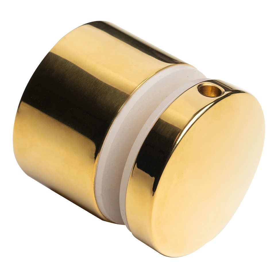 Gouden puntbevestiging voor glas Ø50 mm van roestvrijstaal AISI 304 met PVD-coating in glanzende uitvoering — professioneel bevestigingselement voor glasplaten met een dikte van 8 tot 21,52 mm. Bestemd voor montage op vlakke oppervlakken, zorgt voor stabiele en esthetische bevestiging van glas zowel binnen in het gebouw als buiten.