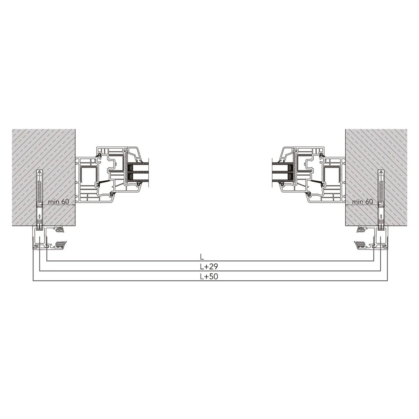 - L + 50 mm — totale buitenbreedte van het systeem (tussen buitenranden van de profielen)