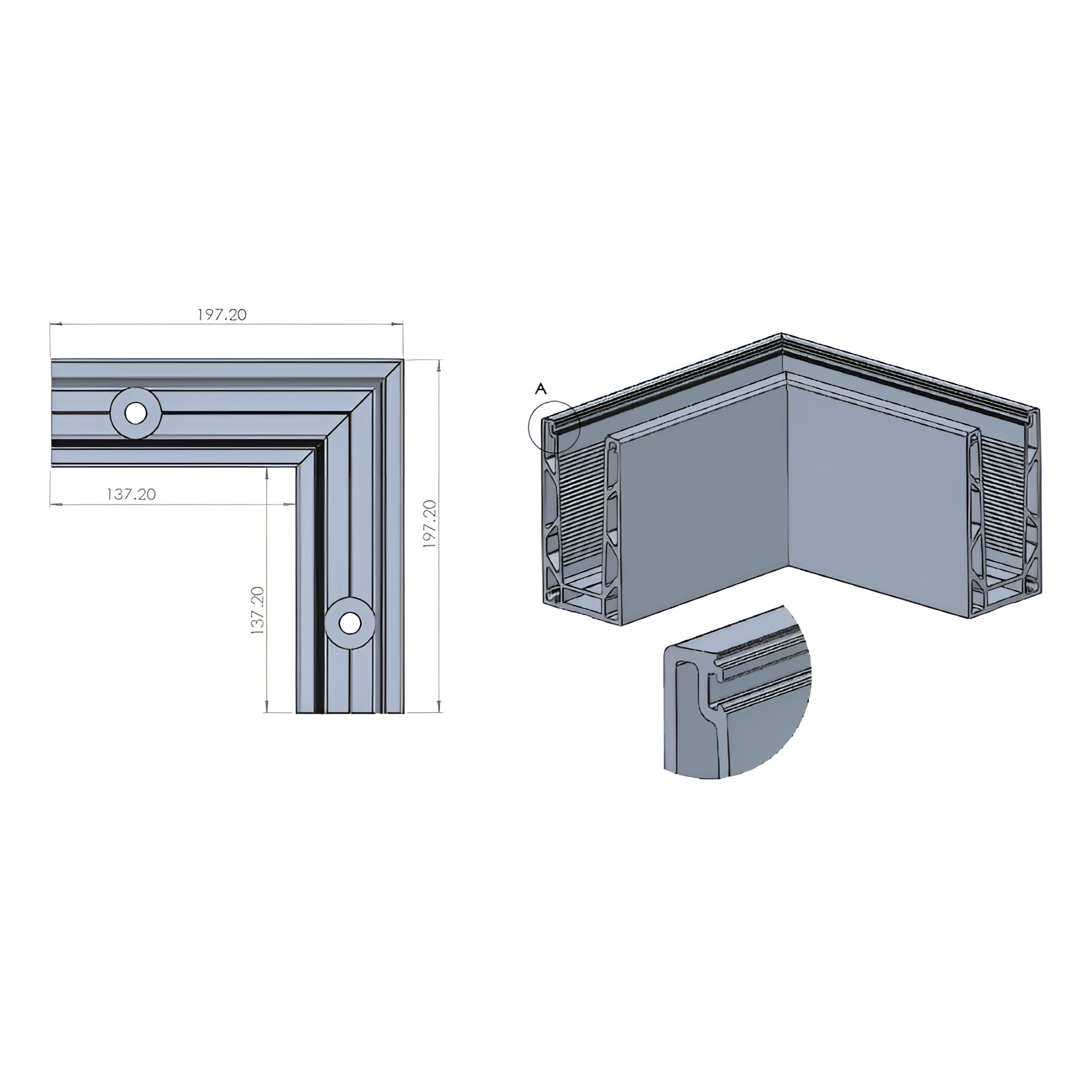 Het hoekstuk U-profiel type KE 100 van het merk Kozza is een element bestemd voor het afsluiten van externe hoeken van 90° in volledig glazen balustrades die van bovenaf gemonteerd worden. De symmetrische armen met een lengte van 197 mm zorgen voor een nauwkeurige verbinding van twee glasplaten in een rechte hoek — zonder verspringingen en kieren, met behoud van een uniforme lijn van profiel en ruit in één vlak.