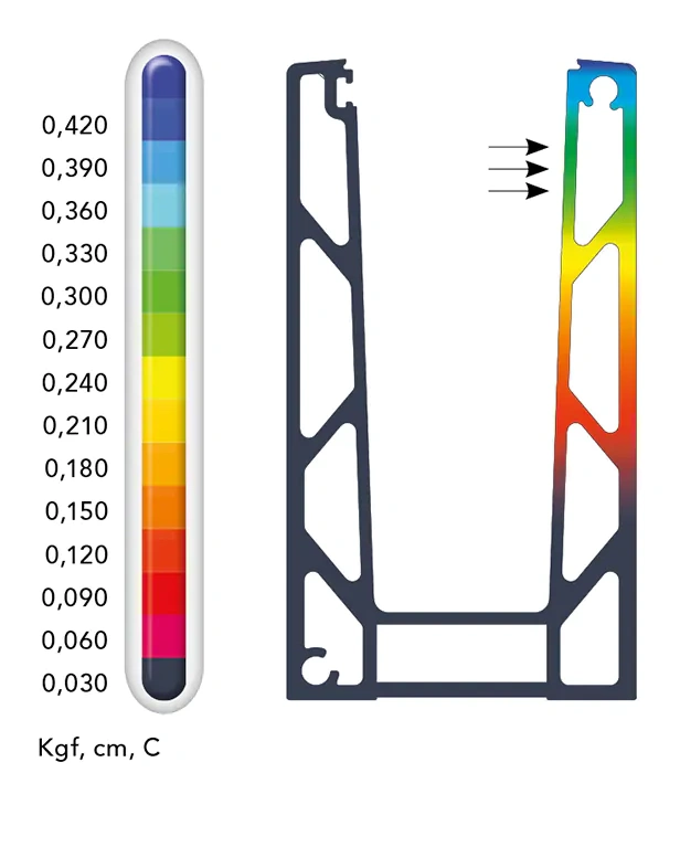 Resultaten van verplaatsingsanalyse uitgevoerd met de eindige elementen methode (FEM) bevestigen de hoge stijfheid van de constructie. Simulatie uitgevoerd voor profiel met basis lengte 1 m, bij horizontale belasting onder 500 kg (5000 N), van basis tot hoogste punt van het profiel. Maximale verplaatsing aan de bovenkant van het profiel valt binnen toelaatbare grenzen (schaalwaarden van 0,030 tot 0,420 Kgf, cm, C), wat veilig gebruik van de balustrade garandeert.