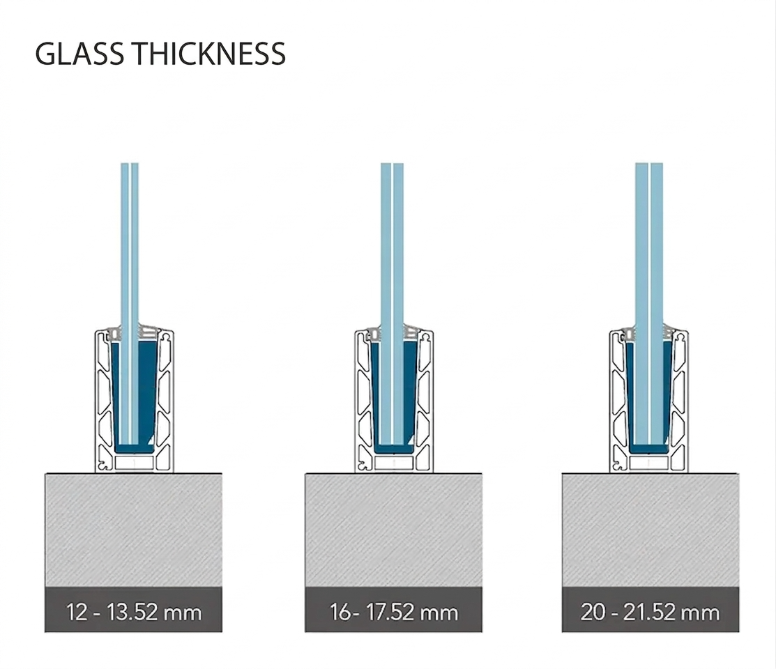 Het KE 100 profiel ondersteunt drie bereiken van glasplaat diktes, waarmee de oplossing aangepast kan worden aan projectvereisten en geldende veiligheidsnormen: