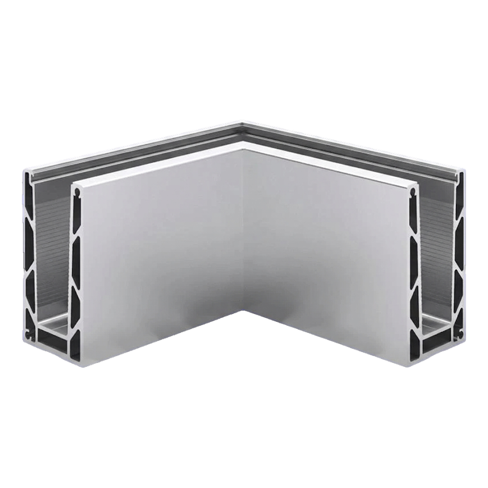 De hoek is bestemd voor volledig glazen balustradesystemen die van bovenaf gemonteerd worden — geschikt voor balkons, terrassen, entresols en trappenhuizen, overal waar glazen panelen van richting veranderen onder een rechte hoek op een buitenhoek. Montage van bovenaf maakt snelle positionering van het profiel op een klare vloer of attiek mogelijk, wat de installatietijd verkort en de noodzaak elimineert om gaten in de ondergrond aan de zijkant van de constructie voor te bereiden.