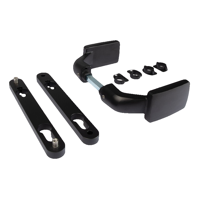 De ergonomische greep is speciaal ontworpen om schuren van de hand tegen de steunplaat op de paal te voorkomen — dit is een belangrijk voordeel bij intensief gebruik op commerciële en industriële objecten. De set bevat twee montageplaten, een paar handgrepen, een verbindingsstift en bevestigingsschroeven met vleugelmoeren, wat zorgt voor snelle en probleemloze montage.