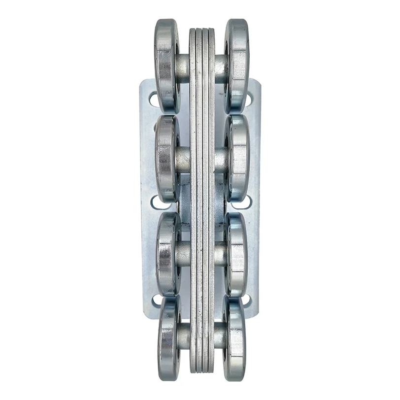 Zwenkbare rijwagen met 8 rollen is een robuust geleidingselement voor railschuifpoorten, compatibel met rail 6V.089. De meervoudige centrale plaatconstructie zorgt voor een verhoogd draagvermogen en stabiele werking, terwijl de stalen rollen een soepele geleiding van het poortvleugel gedurende vele jaren gebruik garanderen.