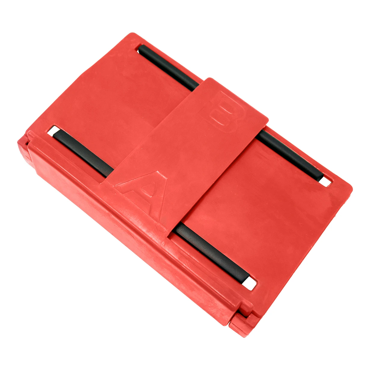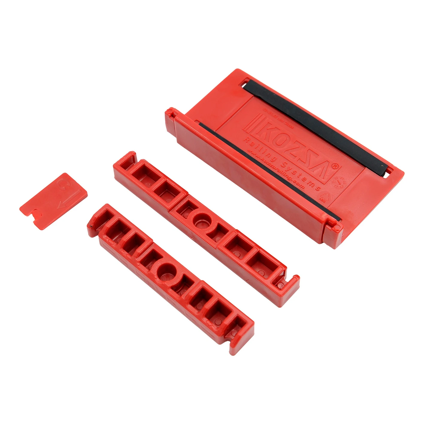 De set bevat 8 complete sets kunststof montage-onderdelen. Elke set bestaat uit meerdere op elkaar afgestemde delen — een hoofdbevestigingsblok met rubberen inzetstuk, twee afstandslijsten en een afsluitdop. De onderdelen zijn gemarkeerd met de symbolen A en B om een correcte oriëntatie tijdens de montage te vergemakkelijken. Het bevestigingsblok heeft een scharnierend openende constructie, waardoor het glas eenvoudig geplaatst en nauwkeurig aangedrukt kan worden met behulp van de rubberen inzetstukken.
