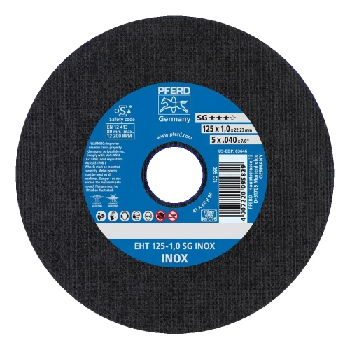 PFERD EHT 125-1,0 SG INOX is een hoogpresterende doorslijpschijf type 41 (recht) bestemd voor precisie snijden van staal en roestvast staal (INOX). Dankzij een dikte van slechts 1,0 mm zorgt de schijf voor een smalle snede, minimaal materiaalverlies en koud snijden — wat bijzonder belangrijk is bij de bewerking van temperatuurgevoelige elementen van roestvast staal. Het Duitse merk PFERD garandeert consistente kwaliteit en veiligheid bevestigd door EN 12413 certificering en het oSa veiligheidsmerk.