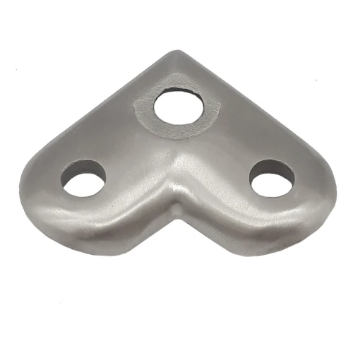 De plaat is bestemd voor het bevestigen van leuninghouders op hoeken — waar de balustradeloop van richting verandert. Montage vindt plaats door de plaat van bovenaf vast te schroeven aan een vlak oppervlak (bijv. paal of dragende zuil). Drie montagegaten zorgen voor een veilige, driepuntsbevestiging en elimineren het risico van rotatie van het element onder belasting.