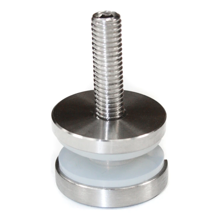 De ronde puntbevestiging (rotule) maakt snelle en zekere bevestiging van glasplaten in roestvrijstalen balustraden mogelijk. De constructie met afstandshuls van 4 mm dikte zorgt voor gelijkmatige afstand tussen glas en montageoppervlak. In de set zit een complete set isolerende afdichtingen die het glas beschermen tegen direct contact met staal — elimineren het risiko van scheuren en zorgen voor stille, stabiele werking van de bevestiging.