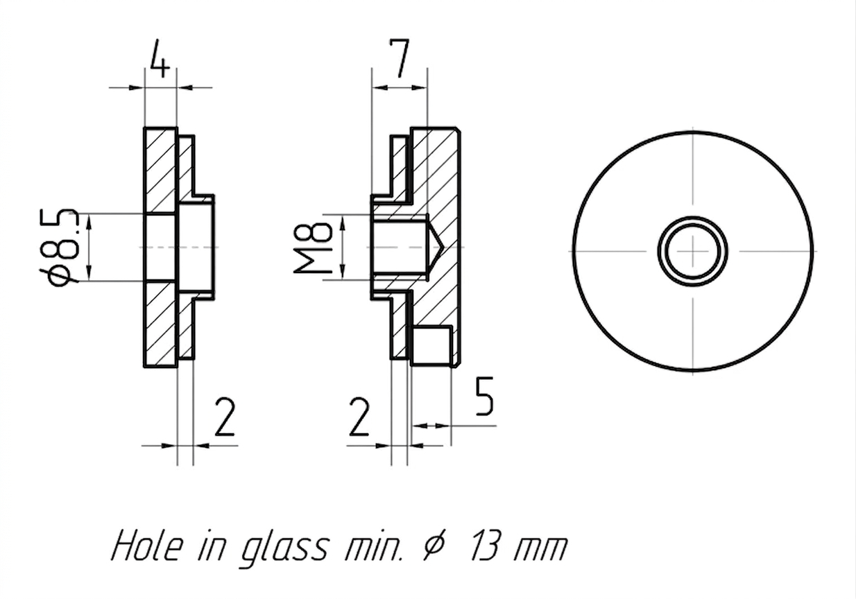 De bevestiging is bestemd voor glas met dikte van 4 mm tot 16,76 mm (inclusief gelaamineerd glas VSG). De minimale diameter van het montagegat in glas bedraagt ø 13 mm. Dankzij de universele schroefdraad M8 integreert het element gemakkelijk met typische roestvrijstalen balustradesystemen gemonteerd aan muren, palen en vlakke constructies.