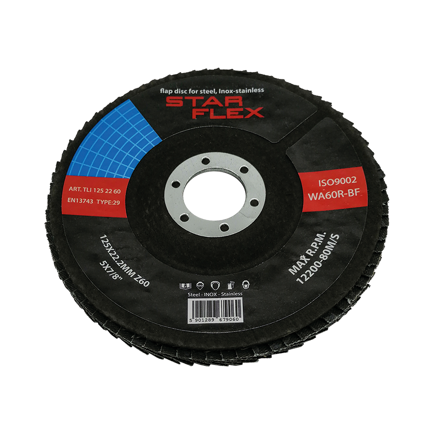 Gebogen lamellenschijf Star Flex T29 met diameter 125 mm met zirkoniumkorrel en granulatie 60 — gereedschap ontworpen voor intensief slijpen van roestvast staal (INOX) en koolstofstaal. De zirkoniumcoating zorgt voor zelfaanslijpende eigenschappen, waardoor de schijf hoge prestaties behoudt gedurende de gehele gebruiksduur, wat resulteert in minder materiaalverbruik en lagere uitvoeringskosten.