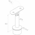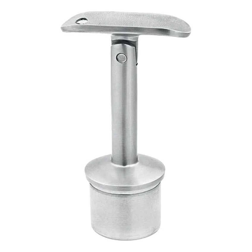 De steun wordt gemonteerd door lijmen — de onderste huls wordt in de paal buis Ø 42,4 × 2 mm geplaatst met behulp van lijm voor roestvrijstaal. Het zadel aan de bovenkant is aangepast aan de leuning met diameter 42,4 mm en maakt het mogelijk elke hellingshoek in te stellen dankzij het scharnier met blokkering door inbusschroef. Deze oplossing werkt bijzonder goed bij trapbalustrades, waar de hoek van de traploop individuele aanpassing van de leuning aan de palen vereist.