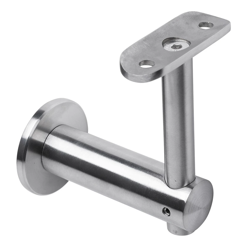 De houder bestaat uit een wandrozet met diameter 50 mm, horizontale arm met diameter 25 mm en verticale paal met platte montageplaat voorzien van gaten voor het vastschroeven van de leuning. De bevestigingsschroefdraad M8 maakt stevige verankering in de wand mogelijk. Het element werkt uitstekend als bekroning van glazen balustraden en klassieke buissystemen — verhoogt de visuele waarde van de constructie en zorgt voor samenhang van het gehele leuningsysteem.